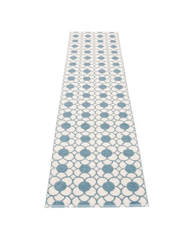 Dette gulvtæppe fra Pappelina måler 70 x 300 cm og har et geometrisk mønster med cirkler. Det vendbare design giver dig to forskellige farvesider: en hvid baggrund med blåt mønster og en blå baggrund med hvidt mønster.