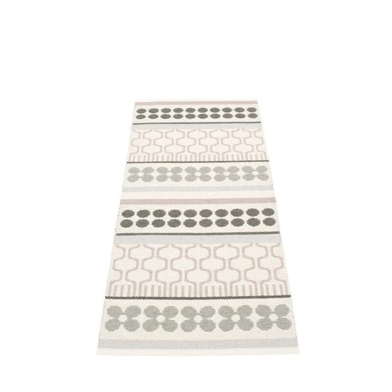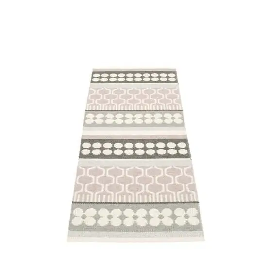 Dette tæppe fra Pappelina har et mønster med geometriske og blomsterlignende former i lyserød, grå og hvid. Designet er opdelt i horisontale striber, der giver en moderne og stilfuld visuel effekt. Hvis du søger et tæppe, der kan tilføre karakter til en gang, entré eller køkken, er dette værd at overveje.
