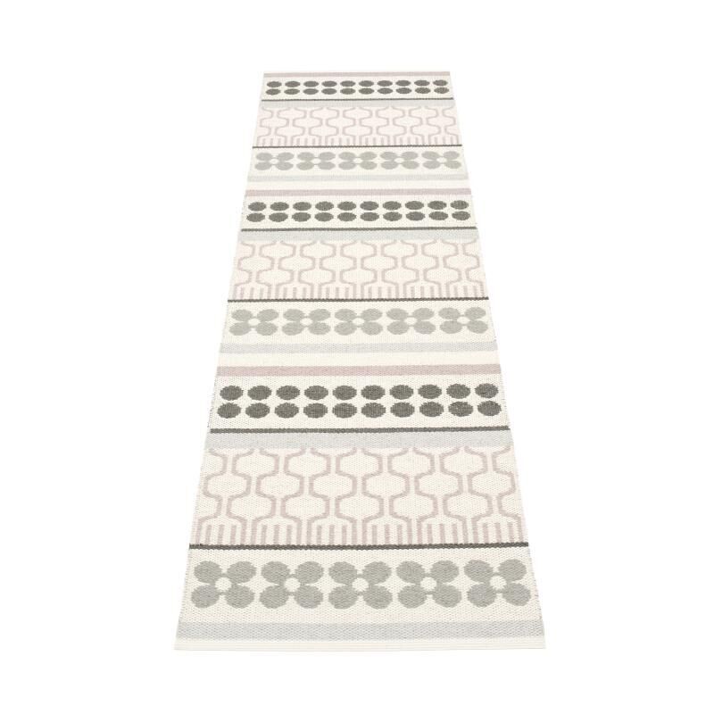 Dette tæppe fra Pappelina kombinerer geometriske og blomsterdesigns i et skiftende mønster, der giver dit rum visuel dynamik. Farveskemaet i lyserøde og grå nuancer skaber en moderne og blød æstetik, der passer til forskellige indretningsstile. Tæppet måler 70 x 270 cm, hvilket gør det velegnet til smalle rum som gange og entréer.