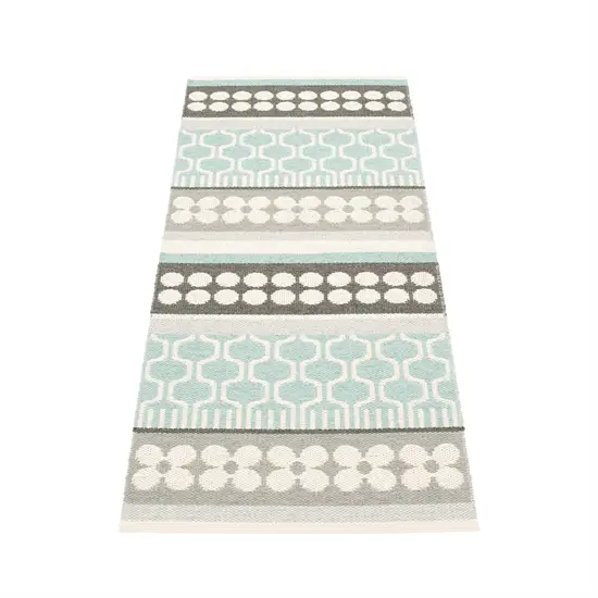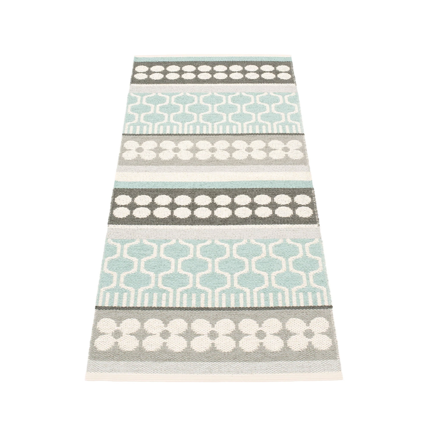 Dette tæppe måler 70x450 cm og passer til lange gangarealer, køkkener eller entréer, hvor du har brug for en løber, der dækker godt. Den lyse turkise farve fungerer som en rolig accent i neutrale rum eller som et supplement til eksisterende blå og grønne nuancer i din indretning.