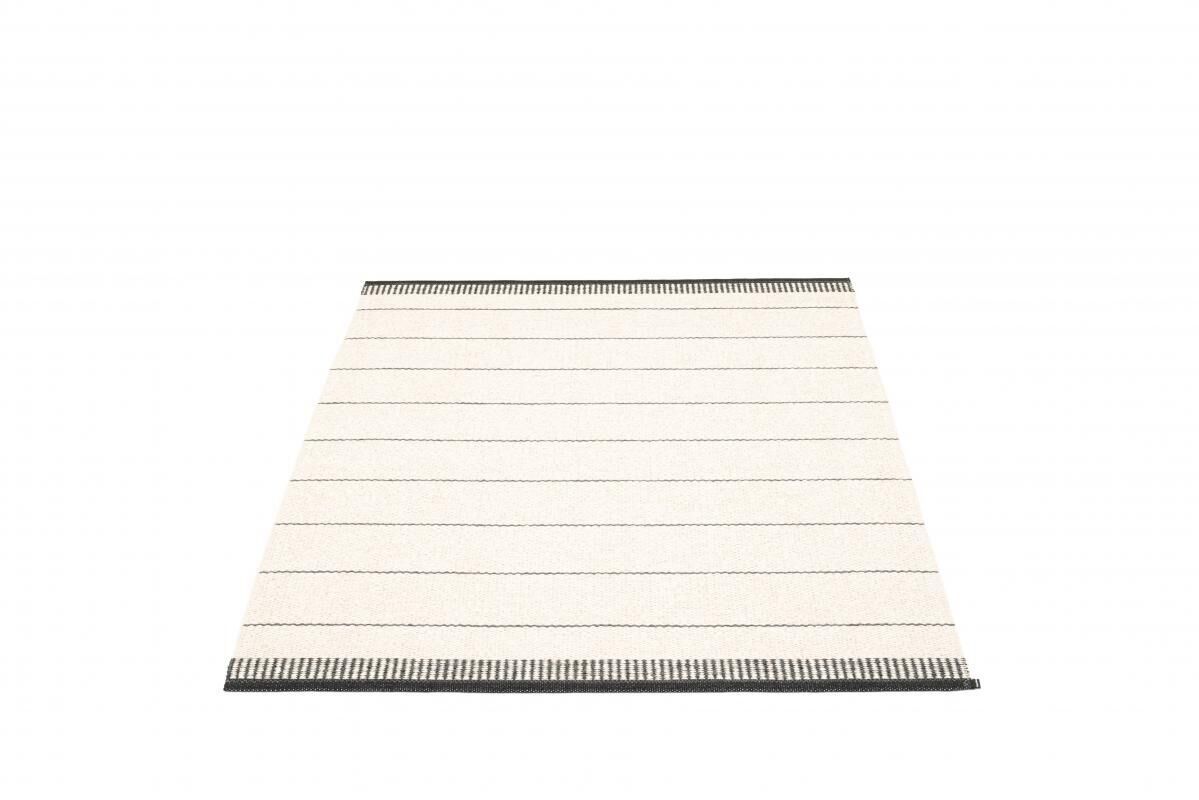 Dette gulvtæppe fra Pappelina har et minimalistisk udtryk med vandrette striber og en mørkere kant med mønster. Designet giver en enkel, moderne æstetik, der passer ind i forskellige indretningsstile. Den mønstrede kant tilføjer en subtil kontrast uden at dominere rummet.