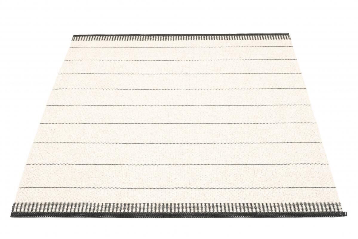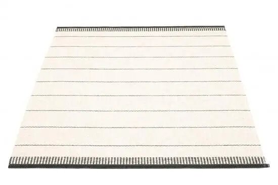 Dette gulvtæppe fra Pappelina måler 230 x 320 cm, hvilket gør det velegnet til større rum, hvor du ønsker et centralt element i indretningen. Det stribede mønster med sorte og hvide striber giver et moderne udtryk, mens de tættere stribede kanter langs siderne skaber et mere færdigt look.