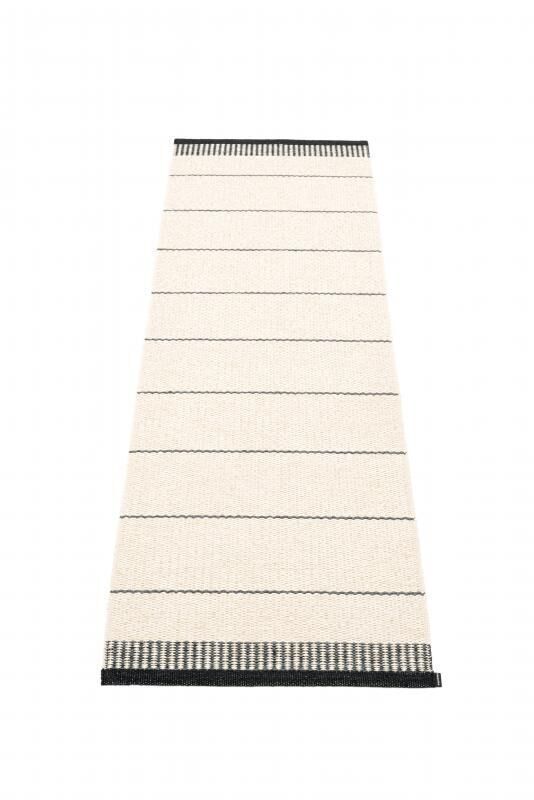 Dette langstrakte tæppe fra Pappelina har en fast sort kant, der giver en pæn afslutning og forhindrer frynser. Kanten fungerer som en visuel ramme, der fremhæver det stribede mønster med skiftevis sorte og cremefarvede striber. Det bringer visuel interesse til dit gulv uden at dominere rummet.