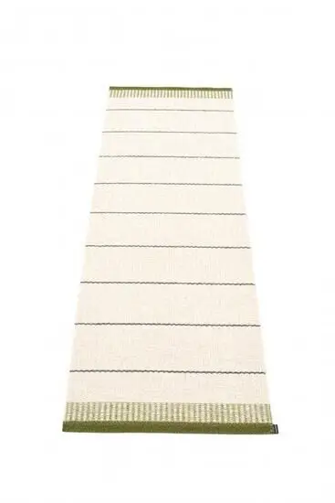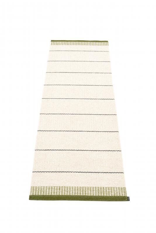 Tæppets konstruktion med forstærket kant betyder, at det holder sit udseende gennem mange års brug. Det stribede design med hvide og mørk olivenfarver giver en stilren fremtoning, der fungerer både indendørs og udendørs. Med målene 60 x 200 cm passer det til entréer, køkkener eller smalle gangarealer.