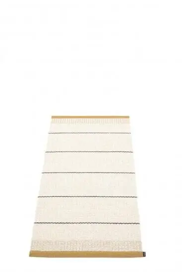 Dette tæppe fra Pappelina har en lys basefarve med mørke, parallelle horisontale striber, der skaber et stilrent udtryk. De okkerfarvede kanter i begge ender tilføjer en farveaccent, som kan hjælpe med at binde forskellige nuancer i dit rum sammen. Det måler 60 x 125 cm.