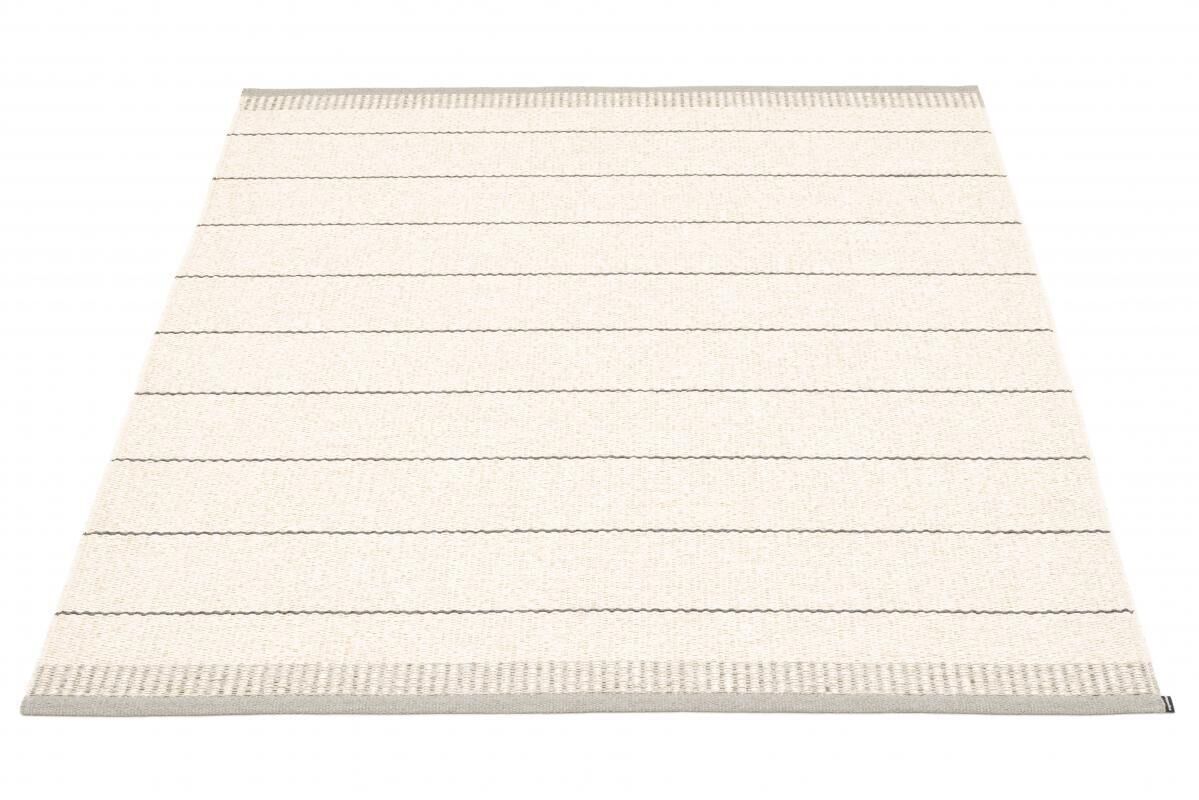 Dette gulvtæppe fra Pappelina har en rektangulær form, der gør det nemt at placere i forskellige rum. Med mål på 230 x 320 cm dækker det større områder og passer godt i stuer eller under spiseborde. Den varme grå farve skaber en rolig base i indretningen.