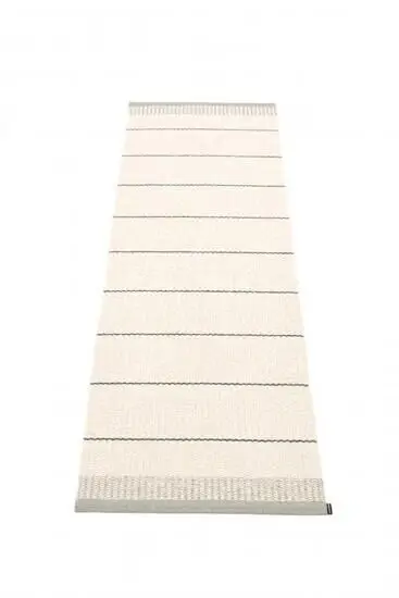 Dette tæppe fra Pappelina har et vandret stribet mønster i varm grå, som giver et moderne og stilfuldt udtryk. Med dimensionerne 60 x 200 cm passer det til gange, køkkener eller andre smalle rum, hvor du ønsker at tilføje visuel interesse uden at overvælde.