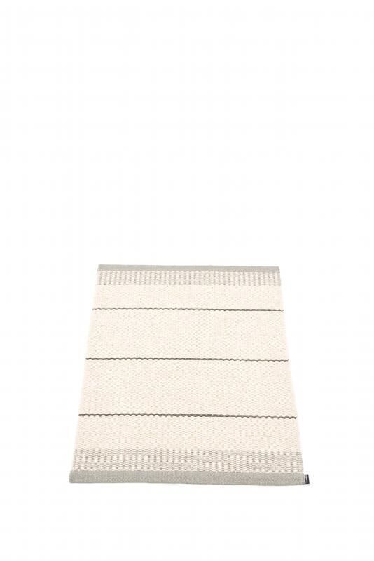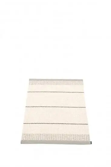 Dette tæppe fra Pappelina måler 60 x 85 cm, hvilket gør det velegnet til mindre områder i dit hjem. Designet består af vandrette striber i forskellige nuancer af grå med en grå kant langs begge ender. Størrelsen passer til entréer, badeværelser eller foran køkkenvasken.