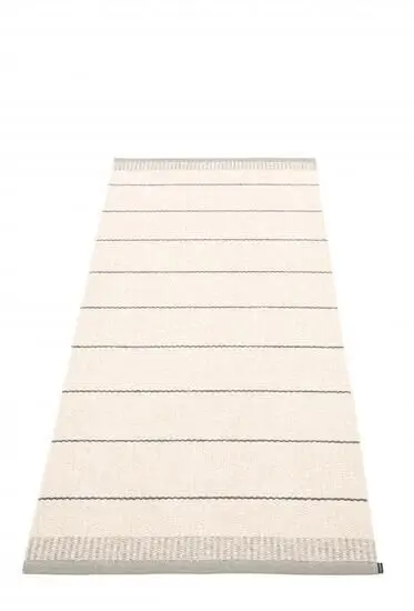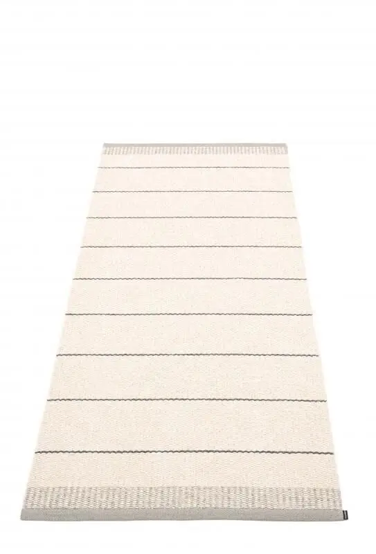 Tæppet har en kant ved hver ende, som forhindrer slid og giver en afsluttet finish. De horisontale striber i warm grey-nuancen tilføjer en rolig visuel rytme uden at dominere rummet. Hvis du søger et tæppe, der kombinerer praktiske mål med et struktureret udtryk, er dette værd at overveje.