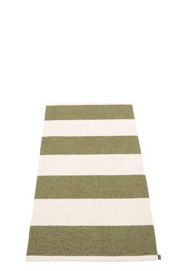 Dette stribede tæppe fra Pappelina kombinerer grønne og beige toner i et klassisk mønster, der passer ind i mange forskellige rum. Den vævede konstruktion giver en robust overflade, der holder til daglig brug både indendørs og udendørs.