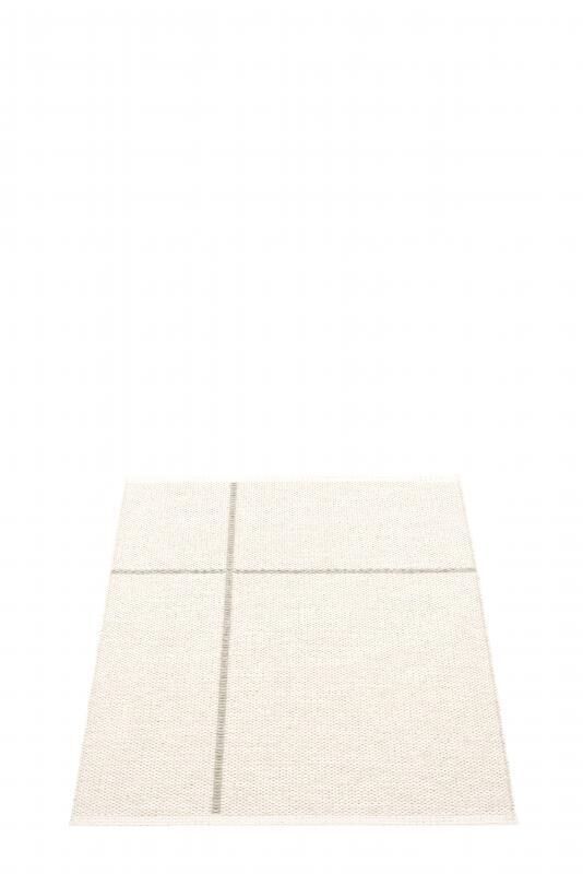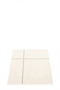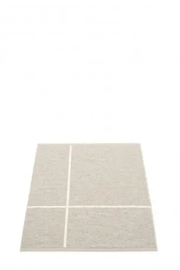 Dette tæppe fra Pappelina har en flad vævningsstruktur, der gør det nemt at rengøre og vedligeholde. Med dimensioner på 70x90 cm passer det ind i mindre områder som entréer, badeværelser eller foran køkkenvasken. Mønstret består af fire kvadratiske sektioner i en lys linfarve, der tilføjer en subtil detalje uden at dominere rummet.