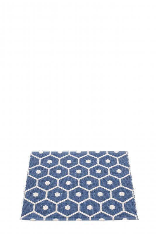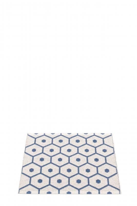 Dette tæppe kombinerer denimblå og hvid i et sekskantet mønster med små prikker i midten. Farverne giver et friskt, rent udtryk, der er nemt at matche med dine eksisterende møbler og farver i hjemmet.