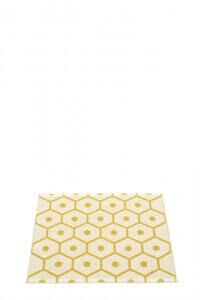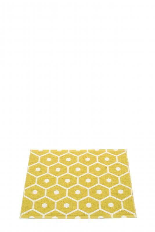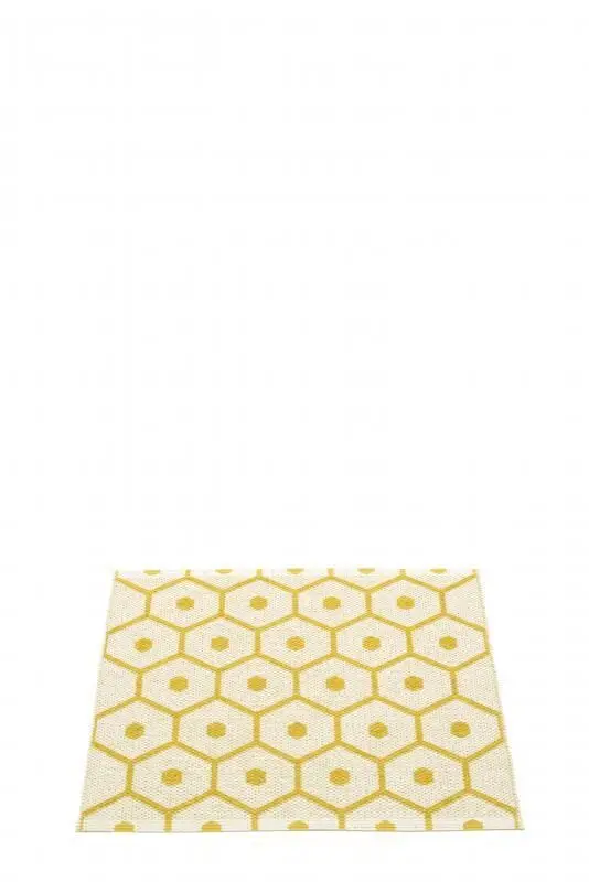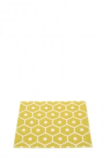 Denne måtte fra Pappelina måler 70 x 60 cm og passer til mindre områder i dit hjem. Det karakteristiske honningkagemønster med sekskanter og cirkler i sennepsgul giver et kunstnerisk udtryk, mens det vendbare design lader dig vælge mellem en lys eller sennepsgul baggrund.