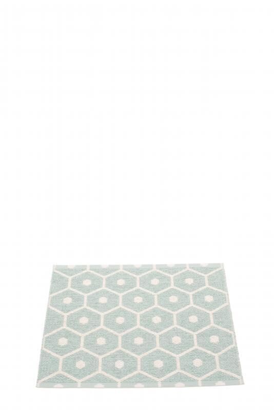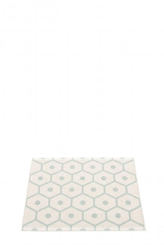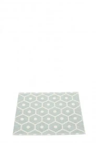 Det hexagonale mønster giver et moderne udtryk, der fungerer i forskellige sammenhænge. Den blege turkise farve er nem at kombinere med eksisterende indretning, og de små prikker i mønstret tilføjer et unikt element, som adskiller det fra mere simple designs. Tæppet kan bruges både inde og ude.