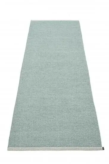Dette tæppe fra Pappelina har en ensartet vævning, der skaber et rent og sammenhængende udtryk gennem hele overfladen. Farven er en lys, afdæmpet nuance i en blød grøn-blå tone, som er nem at integrere i forskellige indretningsstile.