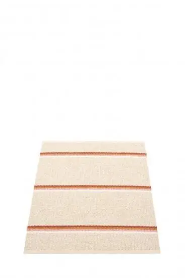 Dette rektangulære tæppe fra Pappelina har et mønster af vandrette striber i lyse farver med mørkere striber i en rødlig nuance. Stribestørrelsen giver en rolig rytme, der fungerer godt i både moderne og klassiske rum uden at dominere.