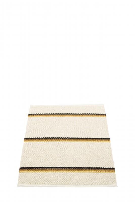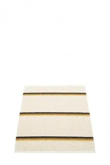 OLLE fra Pappelina har et stribemønster med tre mørkere horisontale striber på en lys okkerfarvet bund. Det kontrasterende udtryk giver et moderne look, der fungerer både indendørs og udendørs. Med dimensionerne 70 x 90 cm passer tæppet til mindre områder som entréer eller foran sofaen.