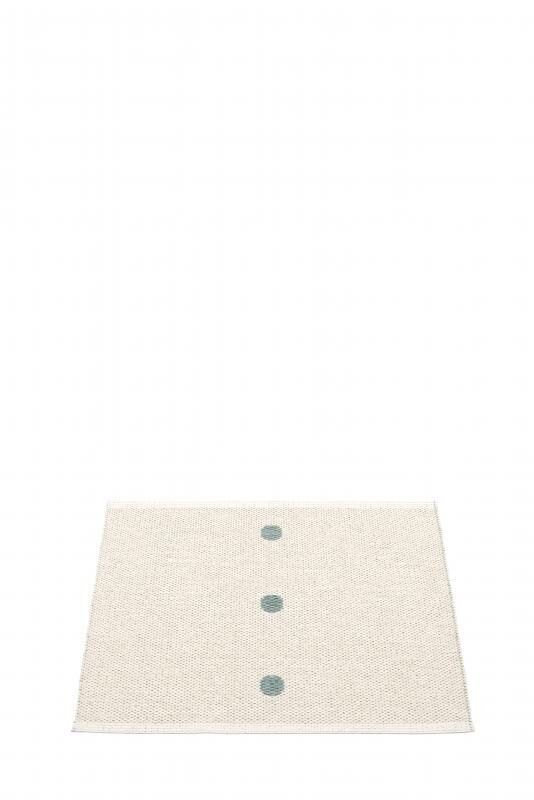 Dette kompakte tæppe fra Pappelina måler 70 x 60 cm og passer til mindre rum som entréer, badeværelser eller foran køkkenvasken. Designet viser tre cirkulære former i lodret linje, og du kan vælge mellem to farvevariationer: en mørkere base med lyse cirkler eller en lysere base med mørke cirkler.