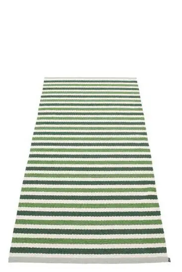 Det stribede mønster i mørkegrøn og hvid giver et moderne udtryk, der fungerer både inde og ude. Farverne er diskrete nok til at passe ind i forskellige indretninger, mens striberne tilføjer struktur. Tæppet er fra Pappelina, som er anerkendt for funktionelle gulvløsninger, der holder til daglig brug.