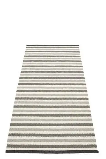 Dette tæppe fra Pappelina har et stribet mønster i forskellige nuancer af grå og hvid. Den neutrale farvepalet gør det let at kombinere med eksisterende møbler og farver i dit hjem, uanset om dit rum er lyst eller mørkt.