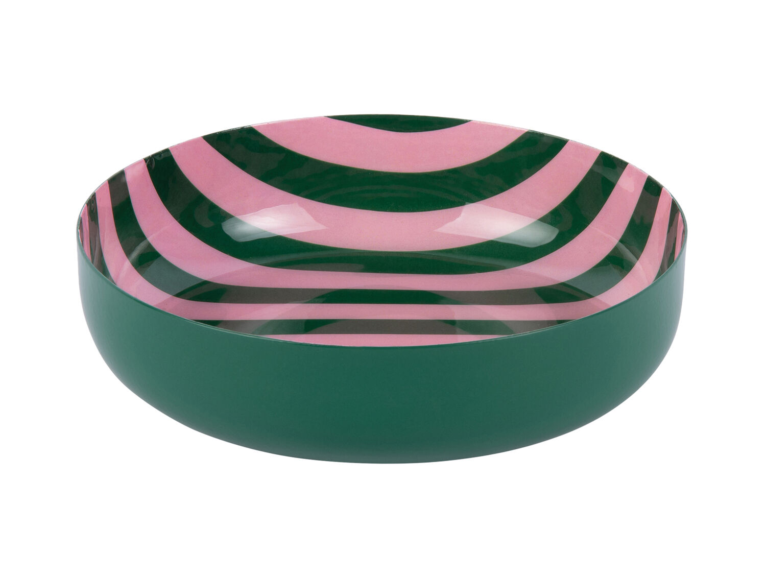Denne skål fra Present Time kombinerer en glat, blank overflade med et unikt stribet mønster indeni. Ydersiden er holdt i retrogrøn, mens indersiden viser skiftevis bløde lyserøde og grønne striber. Den glatte finish gør skålen nem at rengøre efter brug.