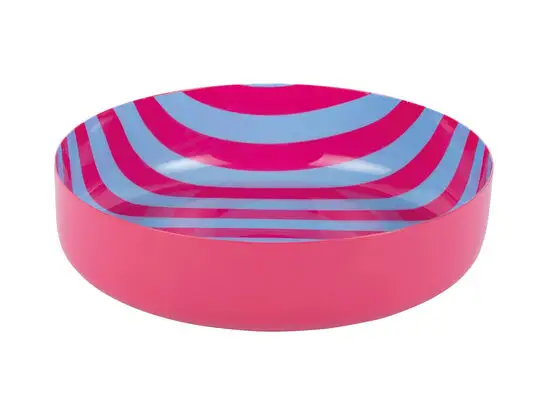 Med en diameter på 18,5 cm er skålen praktisk til servering af snacks, salater eller frugt, mens højden på 4,5 cm giver tilstrækkelig kapacitet. Jernmaterialet sikrer holdbarhed, og det lyse pink udtryk passer ind i moderne indretninger. Det stribede mønster indvendigt skaber et iøjnefaldende look, når skålen er i brug.
