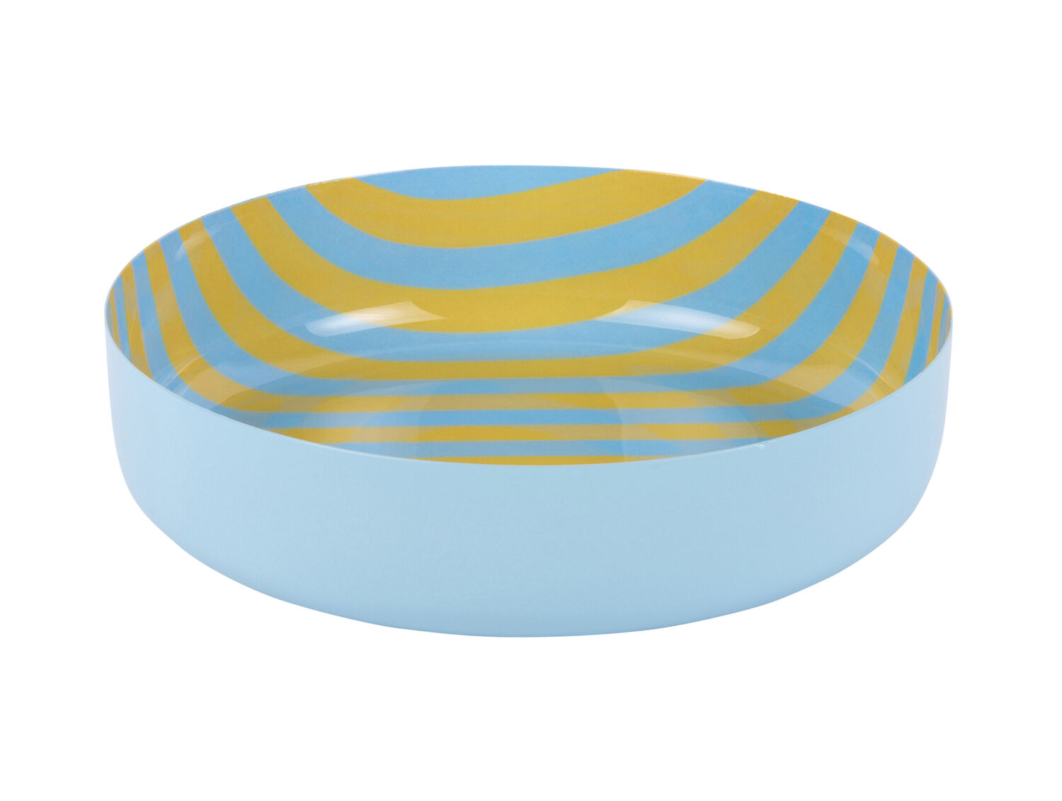 Den citrongule farve indvendigt skaber et friskt udtryk, der fungerer som et visuelt fokuspunkt på bordet. Den bløde blå ydre gør skålen alsidig – den passer ind i forskellige indretningsstile, fra moderne til skandinavisk. Jern som materiale sikrer, at skålen er robust og modstandsdygtig.