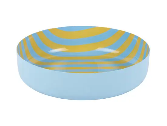 Hvis du søger noget mere end almindeligt hvidt service, giver denne skål dig en kunstnerisk dimension. Det bløde blå ydre skaber ro, mens det indvendige mønster med bølgende citrongule striber tilføjer dynamik. Den glatte finish sikrer, at skålen er praktisk i hverdagen.