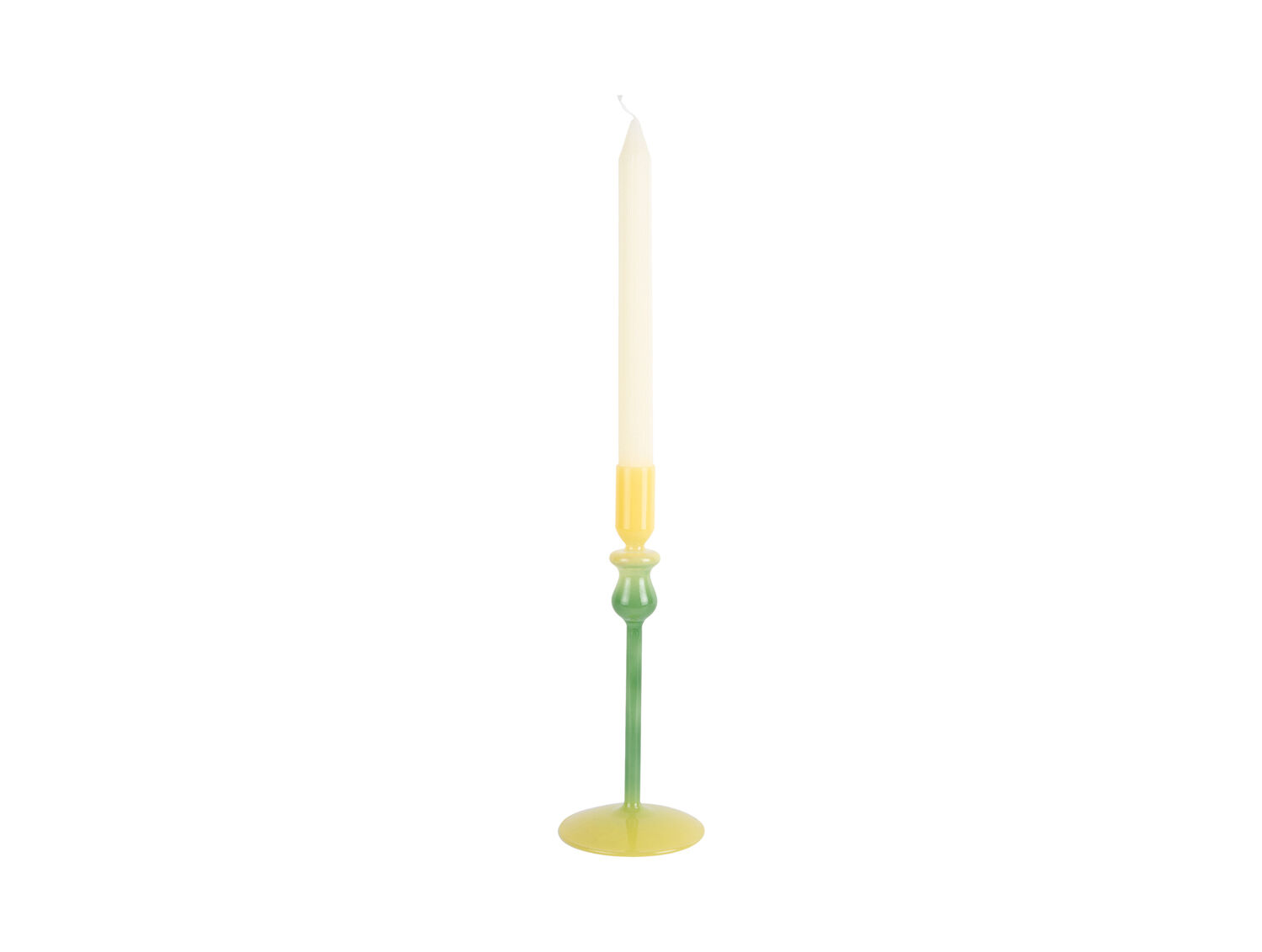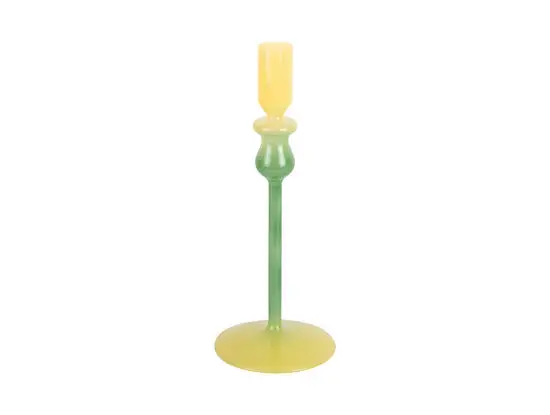 Denne lysestage kombinerer blød gul og retrogrøn i et tofarvet glasdesign. Med en højde på 23 cm er den designet til lange lys og passer godt til både borde og hylder. Den runde base måler 9,3 cm i diameter og giver en stabil placering.