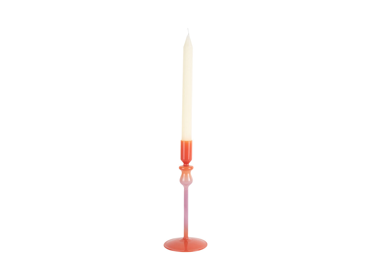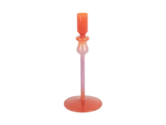 Denne lysestage kombinerer lys orange og blød lilla i et farverigt design, der skiller sig ud i rummet. Fremstillet i glas reflekterer den lyset smukt og tilføjer karakter til dit hjem, hvis du søger tilbehør med personlighed og et moderne udtryk.