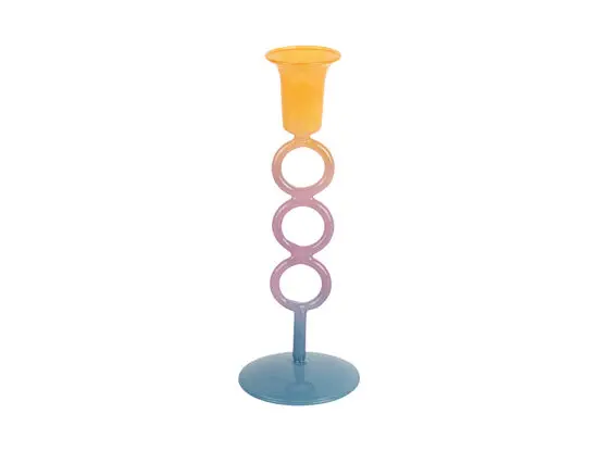 Hvis du ønsker at tilføje farve til dit hjem uden at overvælde rummet, er denne lysestage designet til netop det. Med 21 cm i højden skaber den en markant tilstedeværelse på bordet eller hylden, mens de tre sammenkoblede ringe i farvegradient giver et kunstnerisk udtryk.