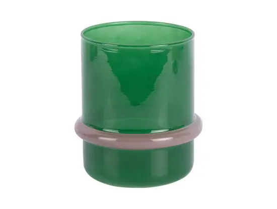 Denne cylinderformede lysestage fra Present Time har en markant retrogrøn farve med en blød lyserød ring omkring midten. Fremstillet i glas skaber den en smuk lyseffekt, når lyset tændes. Med en diameter på 10 cm og en højde på 12 cm passer den godt på både borde og hylder.