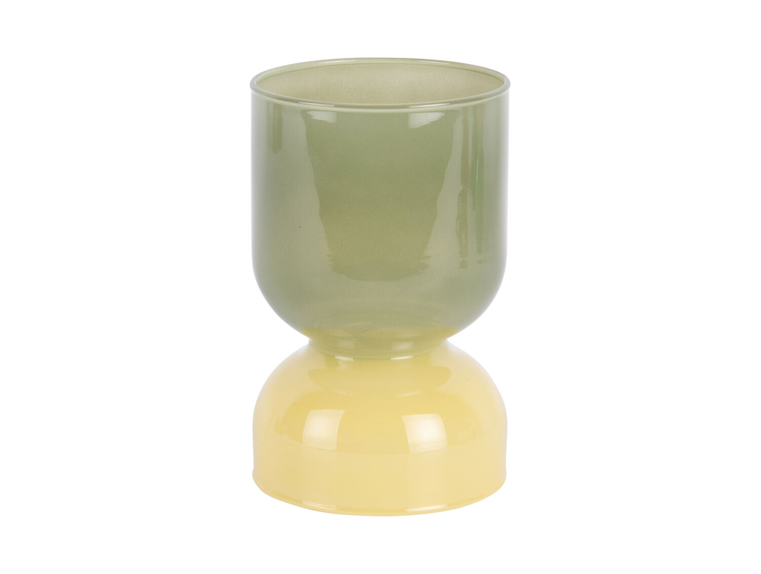 Denne lysestage kombinerer en junglegrøn top med en blød gul base i et tofarvet design. Materialet er glas, hvilket giver et stilrent udtryk og gør den nem at rengøre efter brug. Med en diameter på 9 cm og en højde på 13 cm passer den ind i forskellige rum uden at fylde for meget.