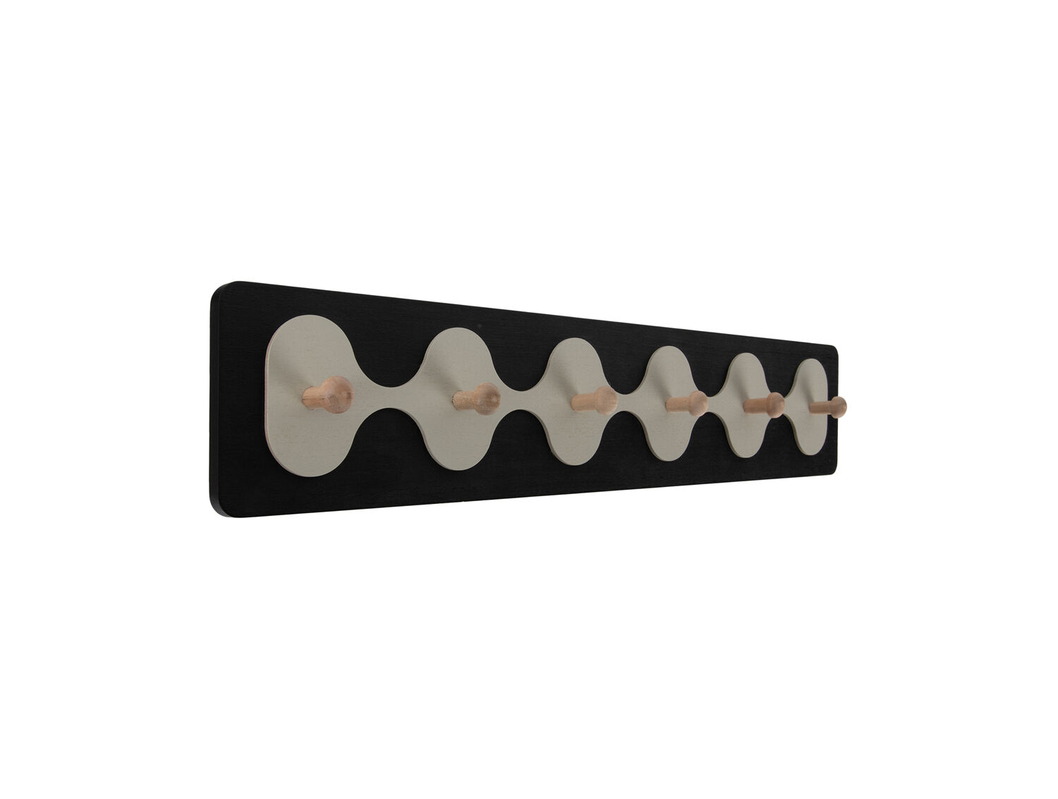 Denne knagerække har en længde på 60 cm, hvilket giver plads til seks træknager fordelt over det bølgeformede design. Basen er lavet af sort MDF og måler 4,5 cm i bredden og 11,5 cm i højden. Det moderne design passer ind i forskellige rum uden at fylde unødvendigt.