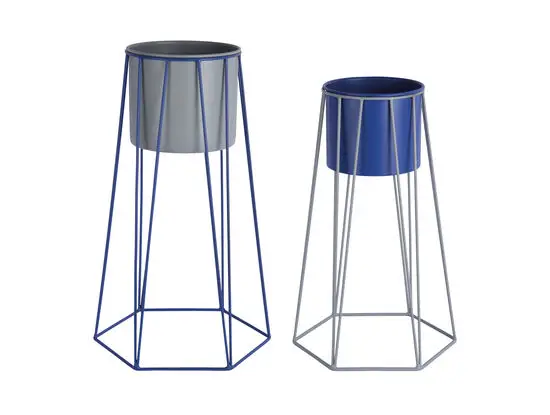 Dette plant pot-sæt kombinerer moderne geometrisk design med robust jernkonstruktion. Sættet består af to potter: én musgrå potte i en koboltblå trådramme og én koboltblå potte i en grå ramme. Med en højde på 56 cm skaber potterne en markant visuel effekt i dit rum.