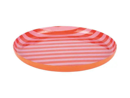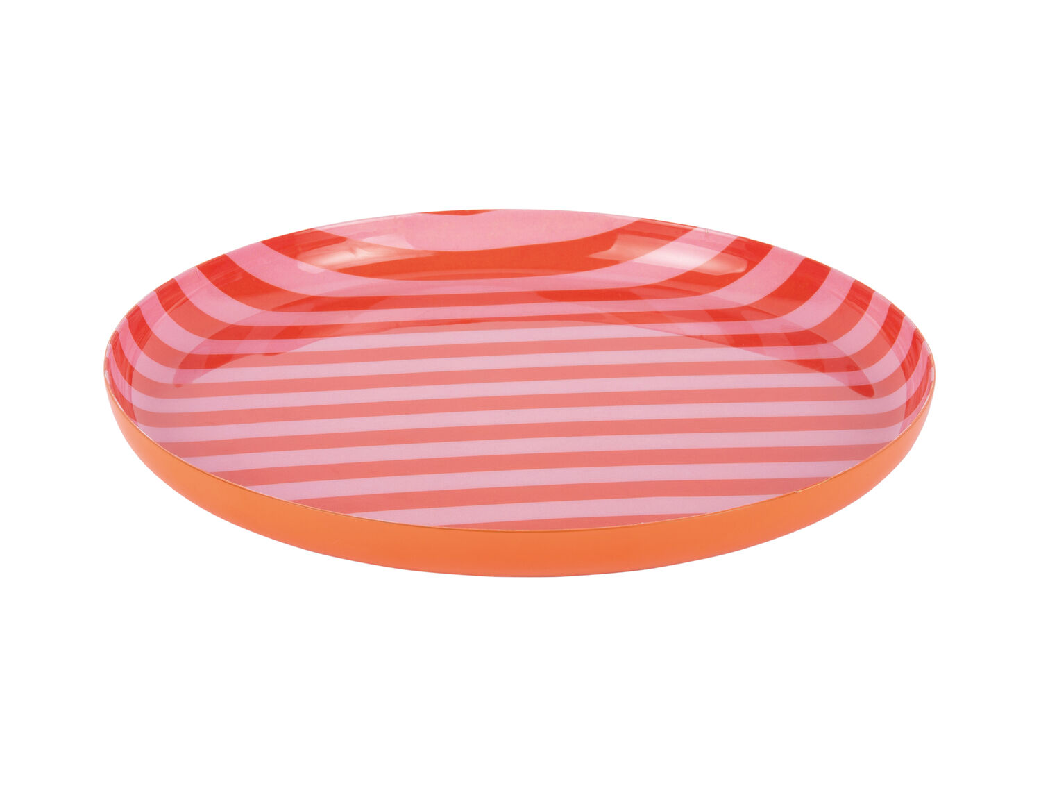 Denne tallerken har et stribet design i lys orange og blød pink, der tilføjer et kunstnerisk præg til din borddækning. Fremstillet i jern med en glat, blank finish giver den et moderne udtryk, mens de 22 cm i diameter gør den alsidig til mange måltider.
