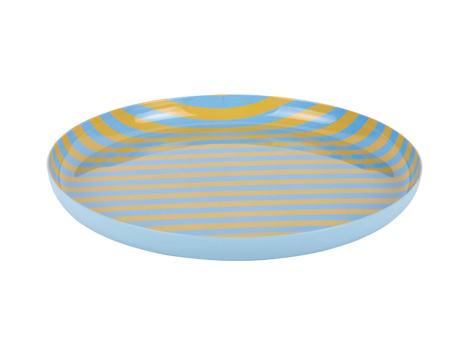 Denne tallerken i jern kombinerer citrongul og blød blå i et stribet design, der tilføjer farve til din borddækning. Med en diameter på 22 cm passer den til daglig brug, og den let forhøjede kant hjælper med at holde maden på plads.