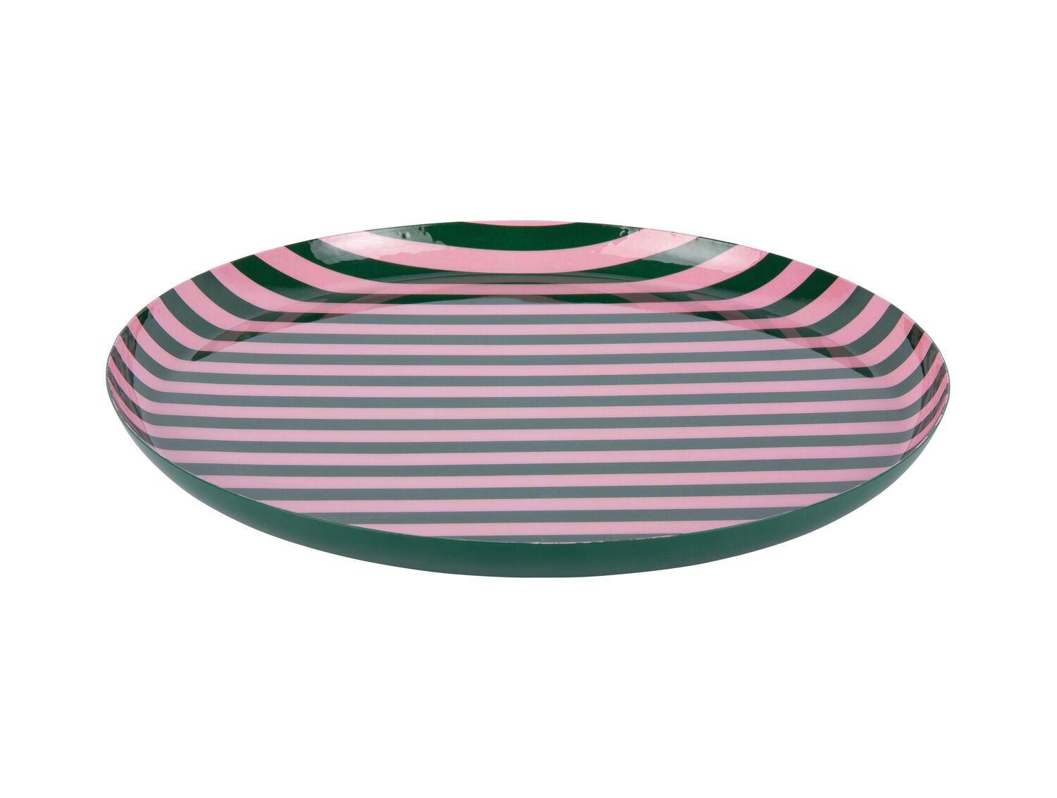 Denne tallerken kombinerer retrogrøn og blød pink i et stribet mønster, der giver din borddækning et kunstnerisk udtryk. Med en diameter på 30 cm er den velegnet til større portioner eller som serveringsfad, når du har gæster.