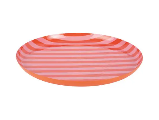Denne tallerken i lys orange bringer farve til dit bord med et stribet mønster i lys pink og orange. Den er lavet af jern med en let hævet kant, der tilføjer dimension til designet og holder maden på plads.