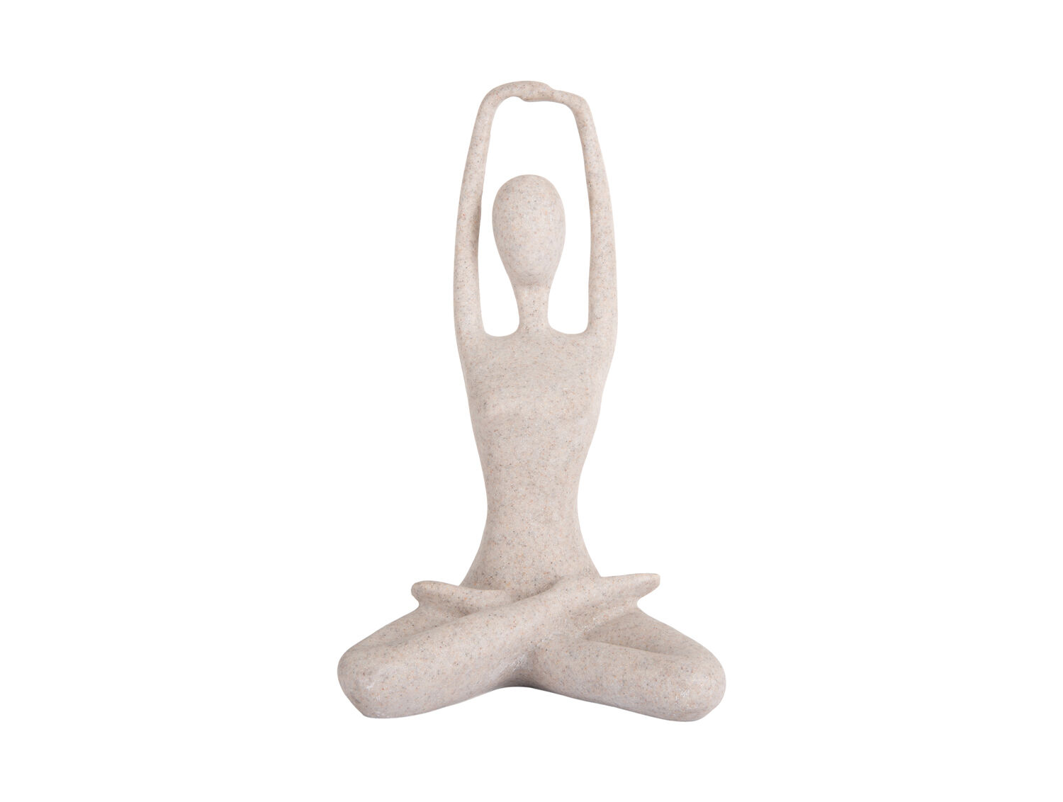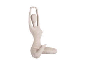 Figuren sidder i lotusposition med krydsede ben og armene strakt i en bue over hovedet. Designet er minimalistisk uden ansigtstræk eller detaljeret anatomi, hvilket giver et roligt udtryk. Overfladen er glat, og materialet tillader fine linjer i formen. Hvis du værdsætter moderne design med fokus på balance, kan denne statue bidrage til en harmonisk atmosfære i dit hjem eller kontor.