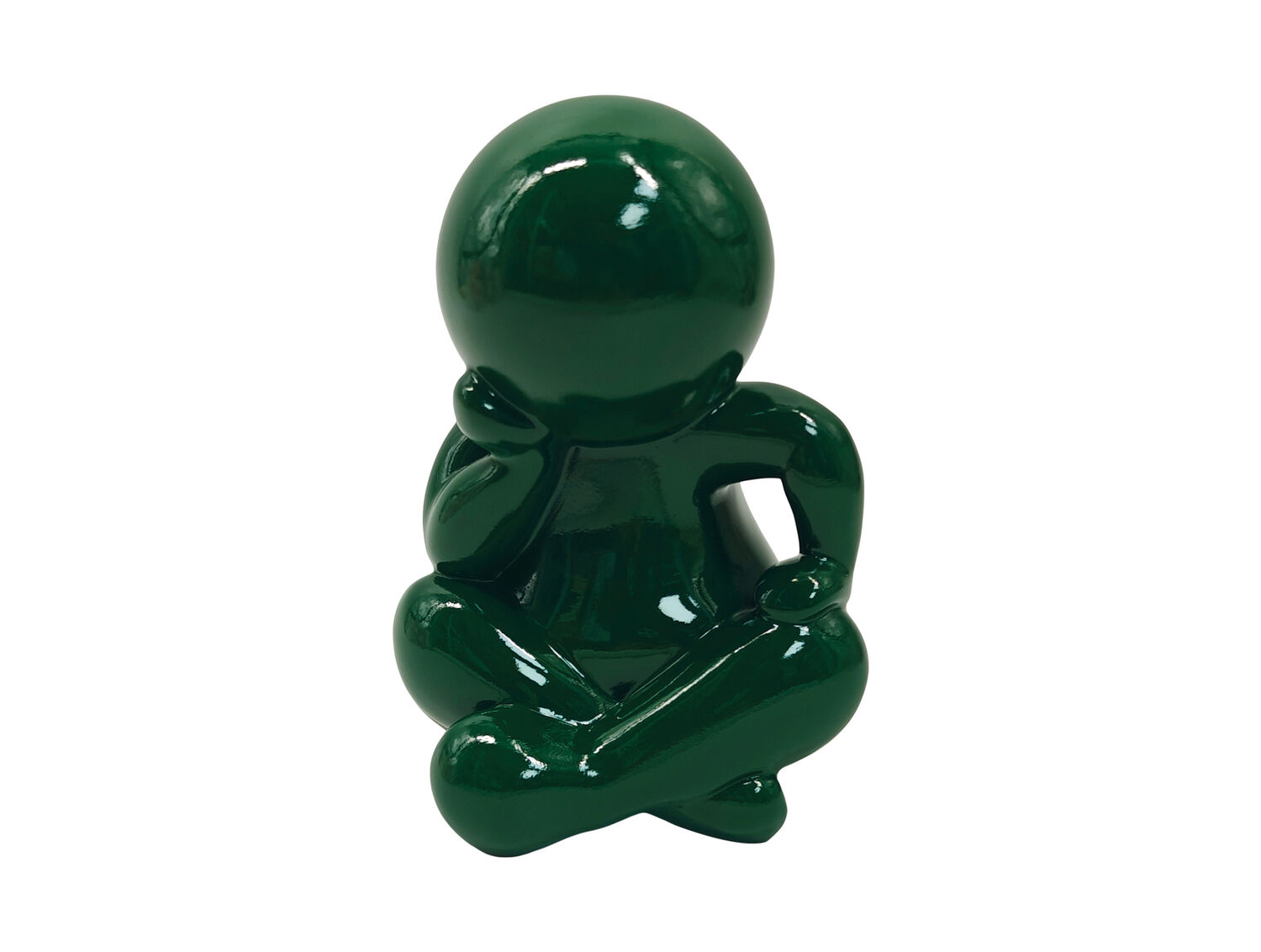Den siddende, tænksomme positur med hånden under hovedet giver statuen et kunstnerisk udtryk. Polyresinmaterialet sikrer en glat, skinnende overflade, der fanger lyset. Den retrogrønne farve fungerer som et moderne designelement, der kan supplere både neutrale og farverige indretninger. Statuen kræver ingen montering og står stabilt.