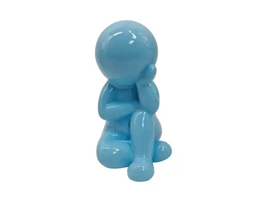 Denne statue forestiller en stiliseret figur i en drømmende positur – hovedet hviler på hånden, mens den sidder i ro. Den bløde blå farve giver statuen en moderne æstetik, der passer ind i både hjemlige og professionelle rum, hvor du ønsker at tilføje et kreativt udtryk.