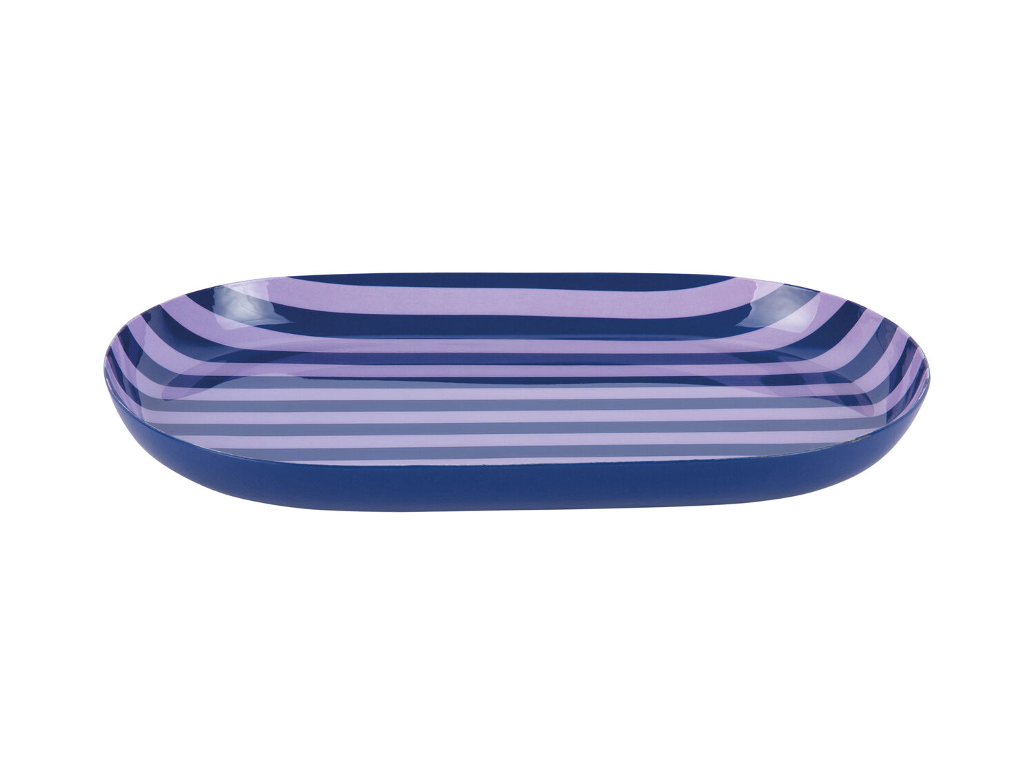 Denne ovale bakke fra Present Time kombinerer koboltblå med bløde lilla striber i et stribet mønster. Bakken er fremstillet i jern, hvilket giver en solid konstruktion, der holder til daglig brug i længere tid.