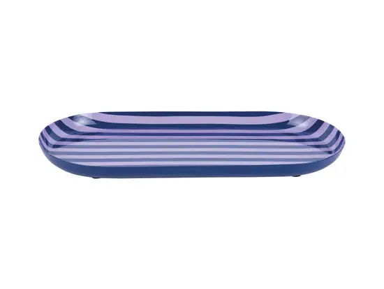 Denne ovale bakke kombinerer koboltblå med bløde lilla striber i et mønster, der giver karakter til dit hjem. Den er lavet af jern, hvilket giver bakken robusthed til daglig brug. Med dimensioner på 38 cm i længden, 18 cm i bredden og 2,5 cm i højden får du en rummelig overflade.
