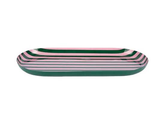 Denne ovale bakke er fremstillet i jern, hvilket giver dig et holdbart produkt, der kan håndtere daglig brug. Med sit retrodesign i grøn med vandrette lyserøde striber tilføjer den et visuelt udtryk til dit hjem, der skiller sig ud fra standardløsninger.