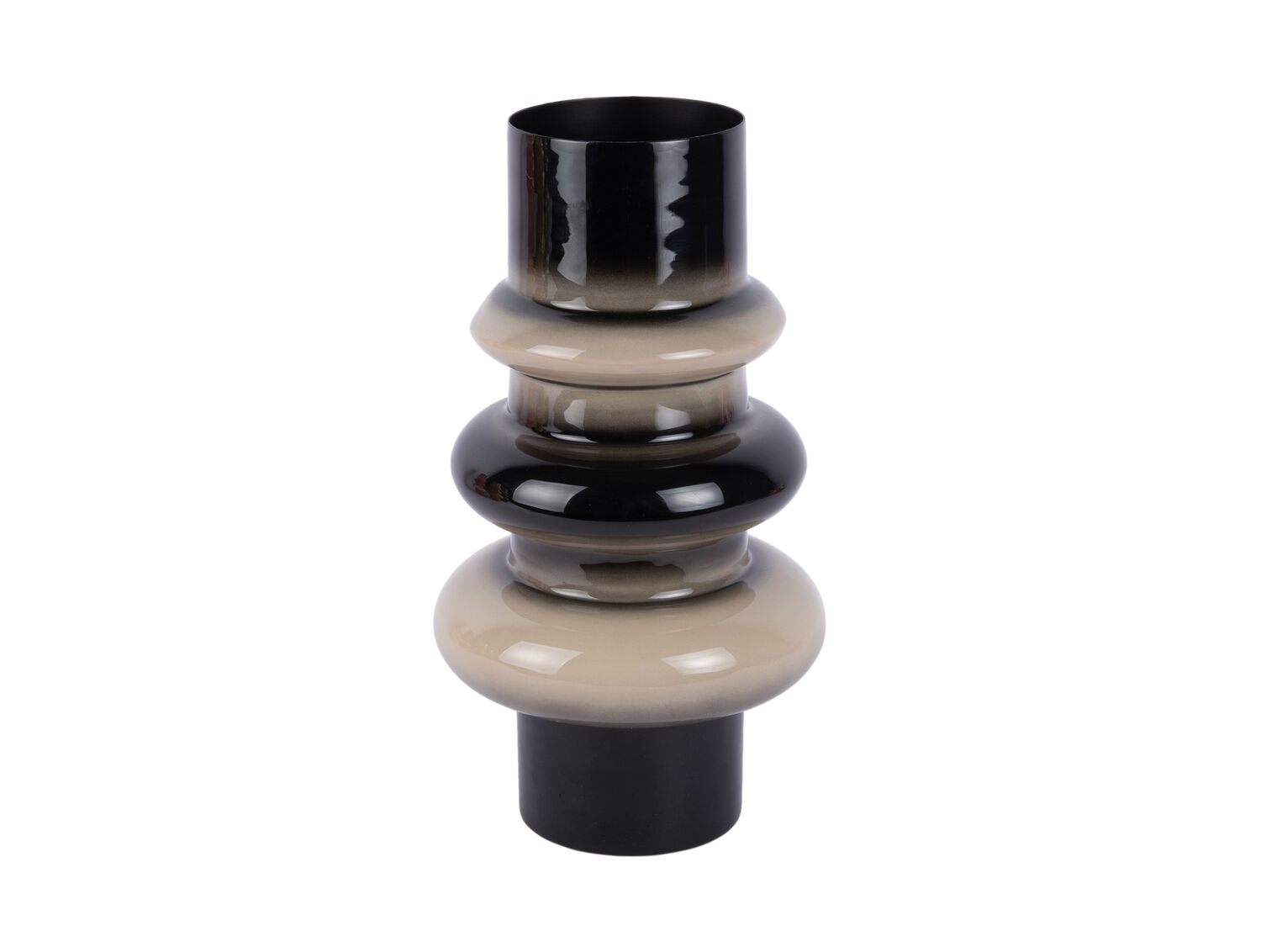 Jern giver vasen en holdbar konstruktion, der kan håndtere daglig brug. Den glatte, reflekterende overflade fremhæver farveskiftet mellem sort og varm grå, hvilket tilføjer en industriel, moderne æstetik til din indretning. Materialet kræver minimal vedligeholdelse og bevarer sit udtryk over tid.