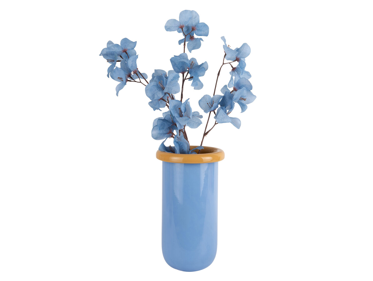 Hvis du leder efter noget andet end den sædvanlige ensfarvede vase, giver den mangogule topkant et moderne twist. Den kontrasterende farve skaber et fokuspunkt i rummet uden at overdrive. Glasmaterialet sikrer, at vasens blå farve forbliver klar og skinnende over tid.