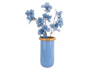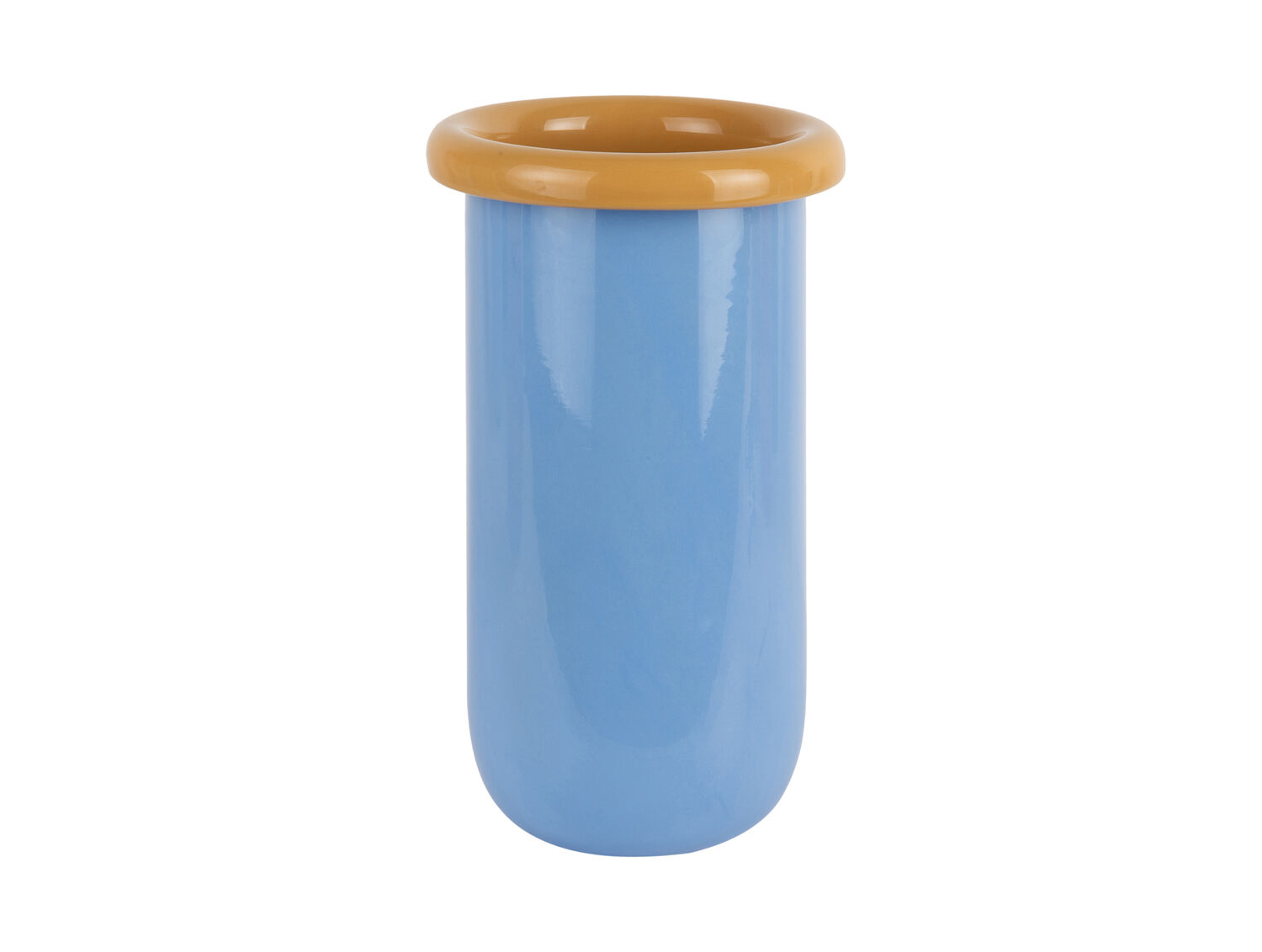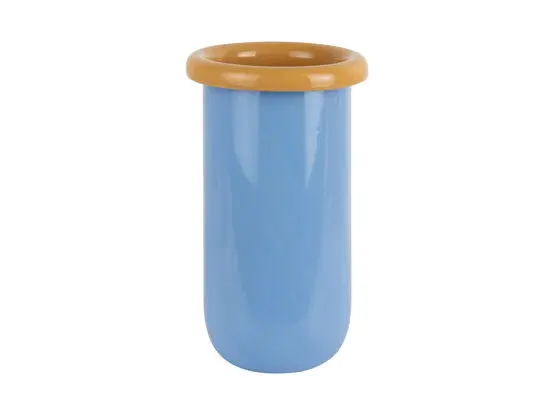 Denne vase fra Present Time kombinerer blødt blåt glas med en iøjnefaldende mango-gul topkant. Glasmaterialet giver en klar overflade, der fremhæver farvekombinationen og passer ind i moderne indretning. Med proportioner på 14 cm i diameter og 25,3 cm i højde får du en vase, der fungerer både alene og med blomster.