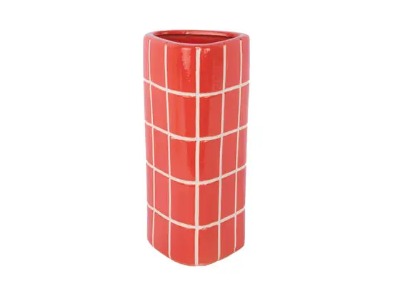 Denne vase bringer et levende element ind i dit hjem med sin lyse skarlagenrøde farve. Den trekantede form med retro flisemønster skaber et iøjnefaldende udtryk, der passer til både moderne og klassiske indretninger. Vasen er lavet af keramik og giver dig mulighed for at sætte dit personlige præg på rummet.
