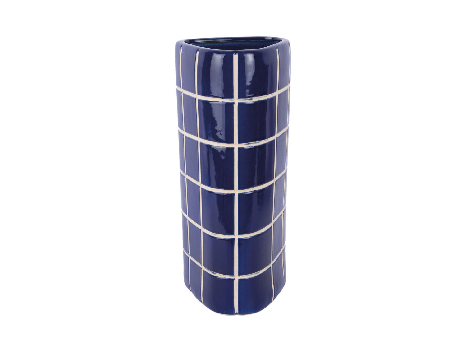 Denne vase i koboltblå keramik har et markant gittermønster med hvide linjer, der skaber en fliseeffekt. Materialet er holdbart og giver vasen en blank finish. Med sin cylinderform passer den til både enkelte blomster og større buketter.